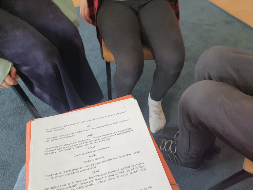 Pewnego dnia, uczennice kl. 6- Julka i Martyna, moje aktorki kółka teatralnego przyszły z pomysłem, by wystawić spektakl na podstawie książki „Chłopiec, kret, lis i koń” (autor Charlie Mackesy). Powiedziałam wtedy, że jest to bardzo mądra książka filozoficzna, jednak w mojej opinii trudna do wystawienia z uwagi na brak fabuły.