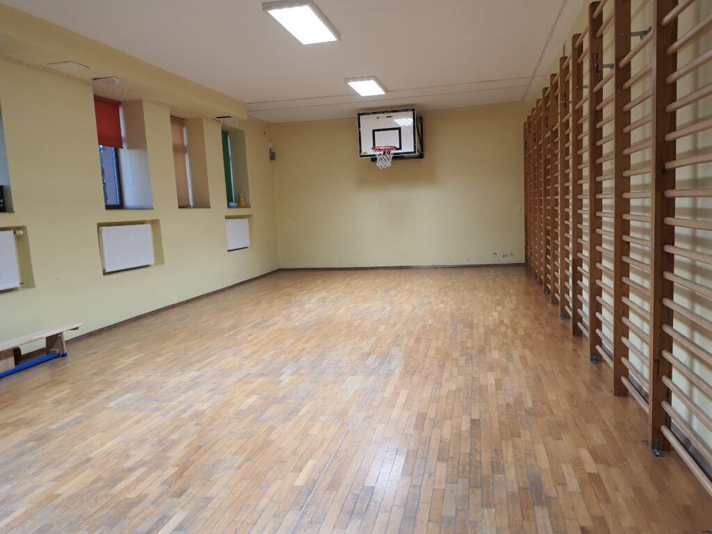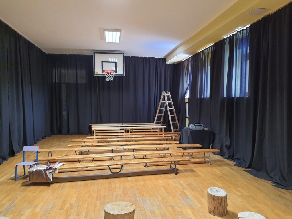 Kilka lat temu zamontowaliśmy w suficie na całej długości i szerokości szyny do firan. Zakupiliśmy czarny materiał, niezbyt ciężki by się nie zrywał z „żabek”. Mamy-krawcowe (także amatorki) moich aktorów uszyły  z nich zasłony długie do samej podłogi, doszywając taśmy firan. Na czas naszej premiery, zawieszamy je z każdej strony. Dodatkowo szyny zamontowaliśmy także przez środek sali od jednego do drugiego boku by móc zawiesić kurtynę. Dodatkowo szyna zamontowana jest także przed koszem do koszykówki. Tam z kolei zawieszamy krótszą zasłonę by kosz był niewidoczny i nie psuł całości wystroju, nie skupiał na nim uwagi widza. Dzięki tym zabiegom udało nam się całkowicie zlikwidować pogłos na sali. Minusem tego jest to, iż jest wtedy bardzo ciepło, wręcz duszno na sali. Nie jest ona klimatyzowana, dlatego tuż przed spektaklem wietrzymy ją intensywnie. Nadmiar przebijającego słońca likwidujemy roletami.
