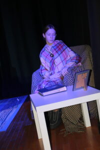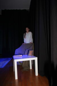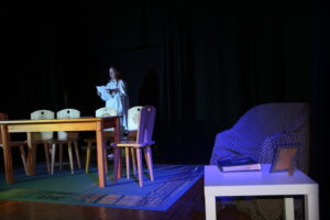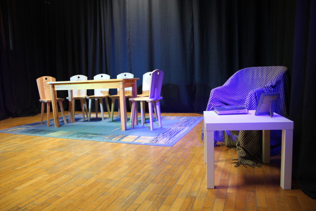 W prostocie siła. Tak więc najważniejszą częścią scenografii było wnętrze pokoju rodziny przygotowującej się do Wigilii. Postawiliśmy na najważniejsze elementy, które powinny się tam znaleźć i będą świadczyć o tym, że jest to świąteczny czas- stół i krzesła oraz choinka. By było wiadomo, że jest to pokój a nie kuchnia-postawiliśmy stół na dywanie.