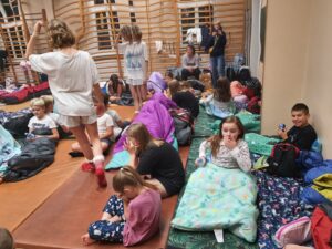 Podobnie, jak z pociągiem, rzecz ma się z noclegiem. Na zaproszenie Tomasza Ordzy, nauczyciela biologii i chemii w Szkole Podstawowej im. Kazimierza Nowaka w Dąbrówce spaliśmy w tejże szkole, na sali gimnastycznej. To był wspaniały czas bycia razem, wspólnych zabaw i rozmów inicjowanych w większości przez aktorki i aktorów naszego kółka.