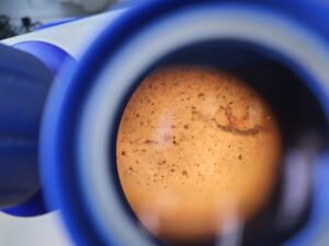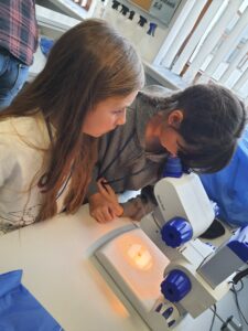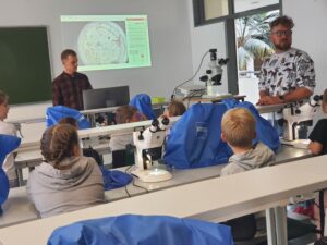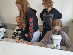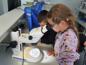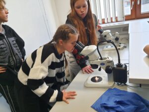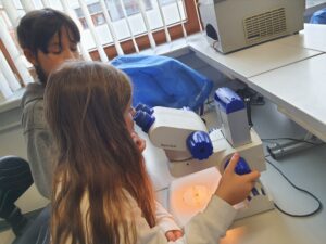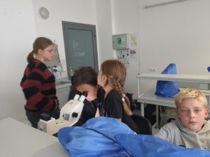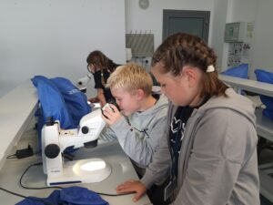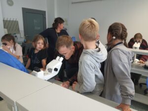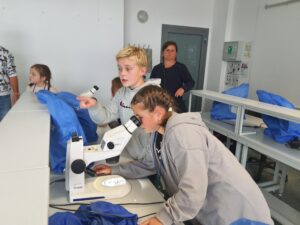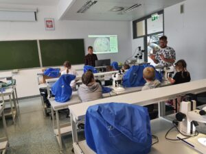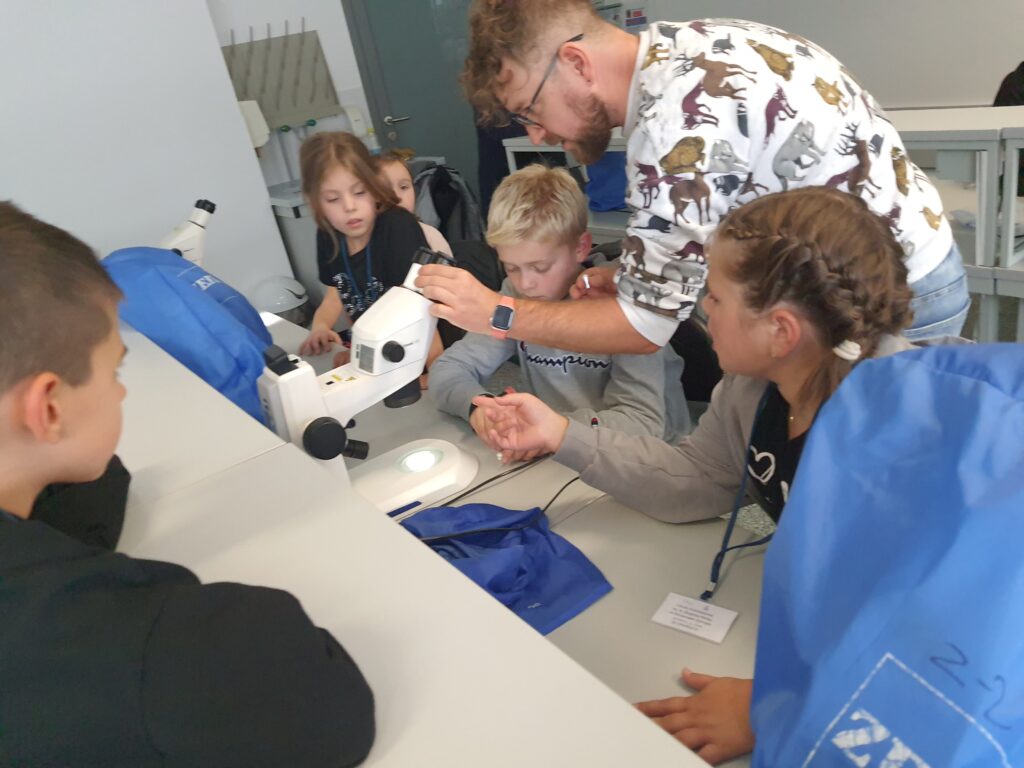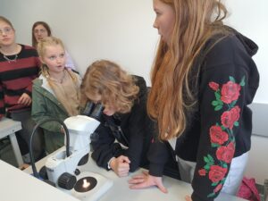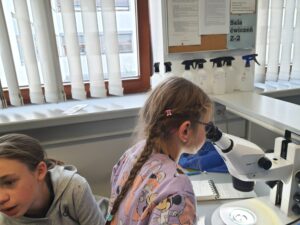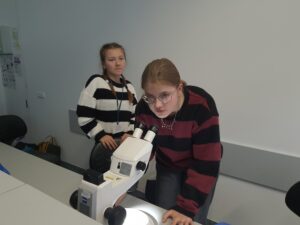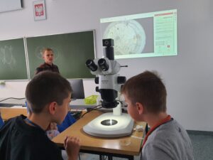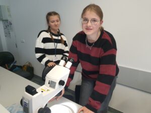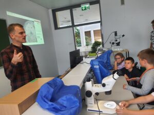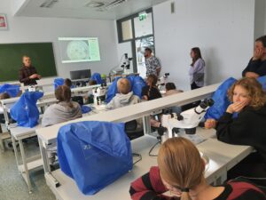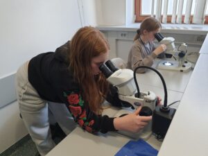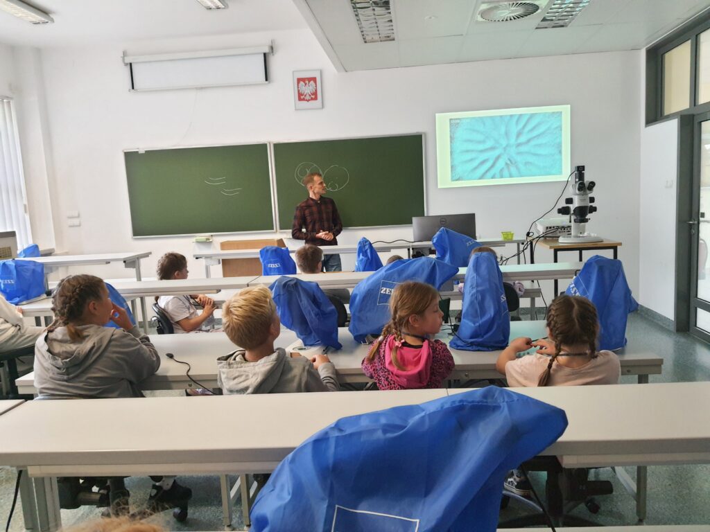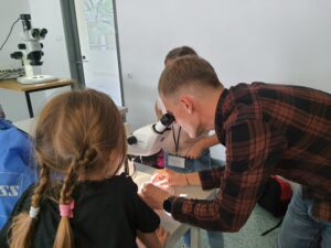 Chwilę później, jak na prawdziwych studentów przystało-skoro był wykład to i musiały być ćwiczenia. Te z kolei poprowadził doktorant Wydziału Biologii Pan Sebastian Chmielewski (trzymamy kciuki za obronę pracy doktorskiej, która już niebawem!). Po niezwykle interesującym wstępie o życiu ptaków, w nawiązaniu do naszych aktorskich zainteresowań przyszedł czas na podglądanie pod mikroskopem roztoczy.
