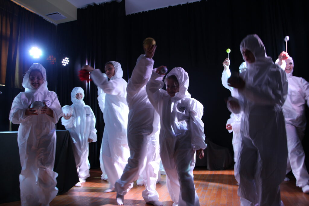 Pomiędzy każdą sceną jedna była powtarzalna. Planety, czyli osoby w białych kombinezonach (malarskich) trzymały w dłoniach swoje planety i miały mówić jakim numerem planety są. By “dodać tu reżyserii” każda miała swój charakter, wchodziła z odpowiednią dla siebie intencją, w taki też sposób się poruszała i mówiła swój tekst „Planeta 363, planeta 362…” Ważny był tutaj rytm, z jego widoczną zmianą. Każda planeta chodziła inaczej, w innym czasie i w innym kierunku.